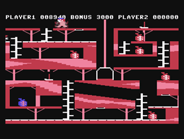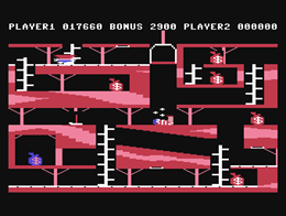 | Minimum animation but colourful backdrop theme. | Help. Get that music out of my head!!! The sounds effects are great too. | A typical arcade platformer. Sometimes it can be frustrating if your character is being chased and he doesn't seem to move up a ladder. There's also some strategy and planning to be done here. | The best little arcade platformer on the C64. Before publishers needed to have licences that is. |
