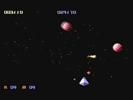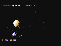 | Excellent. Huge, well-defined sprites zip about all over the place while the amazing spinning starfield does its thing at the same time. Very slick and technically impressive. | Rob Hubbard hits the spot once again with a remix of the Crazy Comets tune. Tons of quality sampled sound effects. | Mad, bonkers, crazy. One of the most manic shoot'em-up experiences on any platform. Two-player mode is especially nice. | A truly earth-shattering blast fest :) |