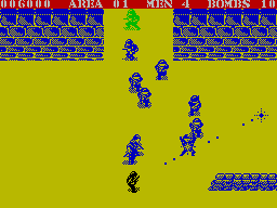 Commando (128k version) ZX Spectrum Elite Keith Burkhill & Nigel Alderton 1986 GTi I have to review this game. It's still my favorite 2D vertical-scroller army shoot-em-up on the Spectrum. I remember when the fair came I "lost" lots of coins on this terrific game. The arcade version was difficult with its frantic action, for me, compared to 1942. You needed quick reactions and had to move on. No time no waste or it was game over in no time. The Spectrum version keeps this frantic action. From the start on you, Super Joe, are being attacked by a well balanced endless stream of soldiers. Some soldiers keep chasing you so a quick turn to put a bullet in them will eliminate them. Be careful, though, to attack soldiers frontally. They have a nasty habit to shoot a final bullet when you think it's safe. But overall their AI is low. You commence in Area 1, with your M60 machine gun and some grenades with limited supply. These can be replenished by taking the red "bricks". You have to battle your way to the final Area. There's no end of level boss so that's a bit of a let down, but I guess this was also the case for the arcade version. You just start all over with more and faster enemy soldiers. All graphics are in, except for the helicopter intro and in-between screens. All backgrounds and sprites have one colour. But everything is very recognisable. The most important thing for this kind of games is the bullet detection and visibility. And it's great. There's no worry that you don't see bullets coming. Although there's the occasional colour clash and slow down it doesn't affect gameplay much. Better shoot some more soldiers to keep the speed up. And thanks to the extra life awarded every 10.000 points you can get far into the game in no time. ![]() I prefer to play this game with the keyboard. The controls are very responsive, same as with the joystick. With the joystick you have to press the fire button for a while to launch a grenade. I still think the Spectrum version is the best 8-bit version. The C64 version, although great sound, was a real let down (but was programmed in a too-tight schedule, I read). A Christmas hit in 1985. Sequels: Duet (aka Commando '87), also from Elite, was an awful unofficial follow up to Commando, released in 1987. The official follow up "Mercs" came out 5 years later and is much better. Your Sinclair: RATING: 9/10 Crash: RATING: 94% "A first-rate arcade conversion - very addictive indeed" Did you know: Commando was released in Germany as Space Aliens (with, yes, aliens replacing the German look-a-like soldiers). |