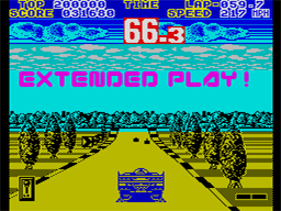 | Enduro Racer like graphics. Smooth road effect and side scenery, but since this is one track game (I guess) it gets repetitive quickly. Hi-score table at the end. | Never heard the arcade version sounds but this 128k version is mediocre. A not so catchy Outrun tune and the sound effects are a let down. | I don't know what to say. I really want to give this a high review score since the graphics are ok, but it misses some real action to keep you coming back. I only replay this game if someone beats my score, so please?! | Nice looking little racer. Technically well done but gets repetitive after some time playing. Overrated back then, methinks. |
